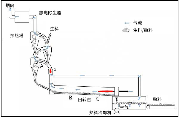 石灰石由窑尾溜槽送入窑内,借助窑体的倾斜与慢速回转,物料既沿圆周方向翻滚,又沿轴向从窑尾向窑头移动。燃料经燃烧器从窑头喷入窑内燃烧,热量通过辐射、对流、传导方式传递给石灰石。石灰石在移动过程中煅烧生成生石灰后,从窑头排出;高温烟气则从窑尾进入除尘系统。