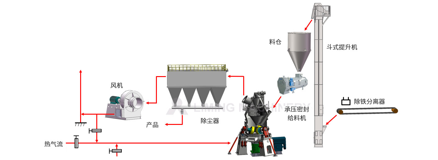 物料通过喂料装置落入磨盘中心,匀速旋转的磨盘在离心力作用下将生料均匀散开、铺平,形成一定厚度的料层。 物料在磨盘上被多个磨辊同时碾压粉碎。在离心力的持续作用下,物料不断向磨盘外缘移动。 离开磨盘的物料遇到通过风环进入磨机的热风,随之上升,经磨机中壳体进入选粉机。 在此过程中,物料与热风进行充分热交换,水分快速蒸发。 选粉机控制成品粒度,大于规定粒径的颗粒被分离并回落至磨盘; 符合细度要求的物料通过选粉机进入成品仓。