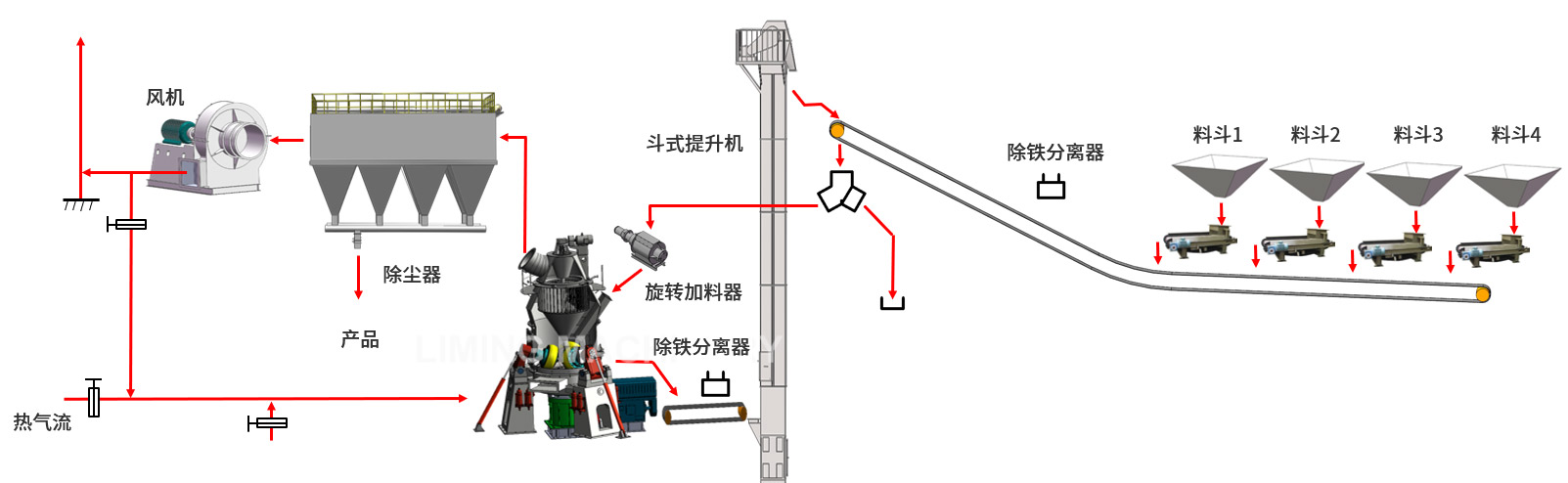 Due to the complex composition, high moisture content, and significant differences in grindability of raw materials, Liming Machinery has spent over twenty years developing the LMR energy-saving grinding equipment, integrating drying, grinding, grading, and conveying. This equipment boasts advantages such as high grinding efficiency, low power consumption, large feed particle size, easily adjustable product fineness, simple process flow, small footprint, low noise, low dust emission, easy operation and maintenance, low operating costs, and low consumption of wear-resistant materials. The product's overall performance reaches international advanced levels, meeting the needs of large-scale, intelligent, and intensive industrial grinding. The maximum production capacity can reach 550 t/h, meeting the raw material supply needs of cement production lines with a capacity of 200-2500 t/d.