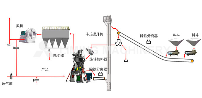 The mill operates on material‑bed grinding: a rotating grinding disc forms a stable material layer, while hydraulic‑powered rollers apply high pressure to crush material through compression and shear. Simultaneously, hot air enters from the bottom air duct, lifting and drying fine particles (moisture ≤8%). An integrated vortex classifier adjusts fineness via blade angle (typically ≤10% residue on 45 μm sieve), combining grinding, classification, and drying in one unit without external drying equipment.
